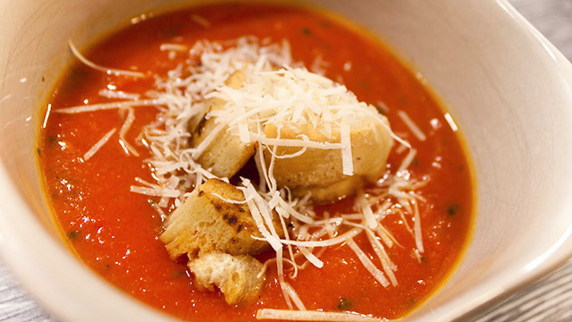 Rajčatová polévka se sýrem a máslovými krutony je zdravé, chuťově vyvážené a jednoduché jídlo, které hravě zvládnou i začínající kuchařky. Recept pro 3 větší porce nebo 4 menší.