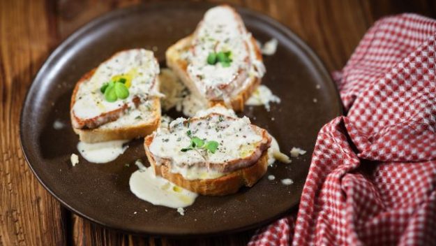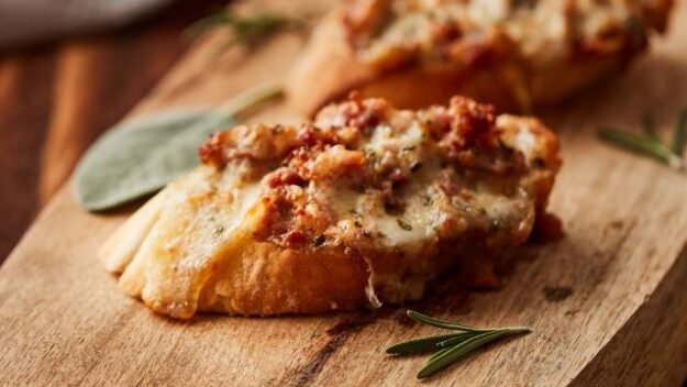 Typická italská bruschetta se sýrem, masem a vůní bylinek.