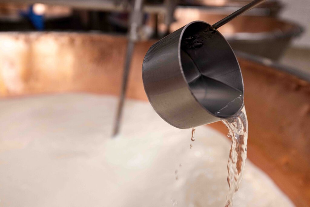 Toto mléko se po tepelném ošetření napustí do tradičních měděných italských kotlů s dvojitým dnem, kde se do něho přidá syrovátka a syřidlo.
