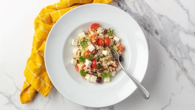 Studený rýžový salát se sýrem a zeleninou, který je stálicí italské letní kuchyně.