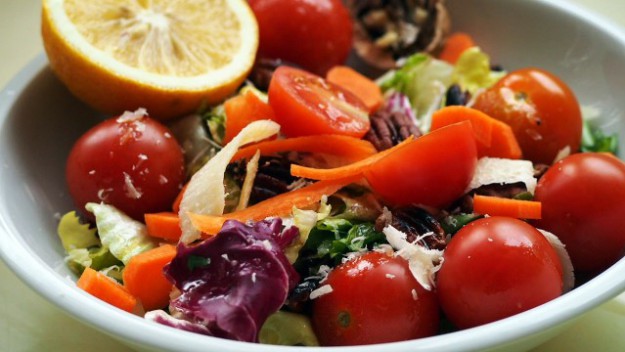 Pestrobarevný několika druhový salát se sýrem Gran Moravia.