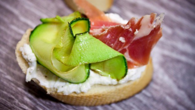 Křupavé jednohubky s ricottovým krémem, cuketou a sušenou šunkou.