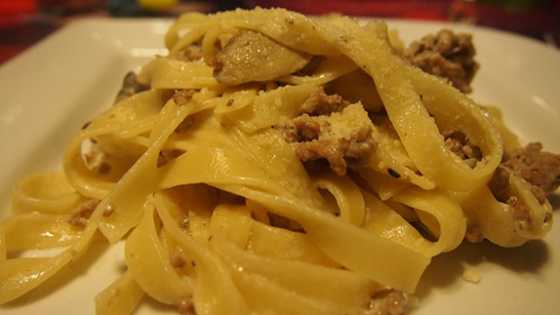 Tento recept je skvělá podzimní pochoutka, hlavně když nasbíráte čerstvé hřiby a nahradíte jimi žampióny. Tagliatelle se dají dělat takto na smetaně na několik způsobů, např. bez mletého masa jenom s houbami a nebo se dá nahradit mleté maso italskou „salsicciou“. Recept pro 2 osoby.