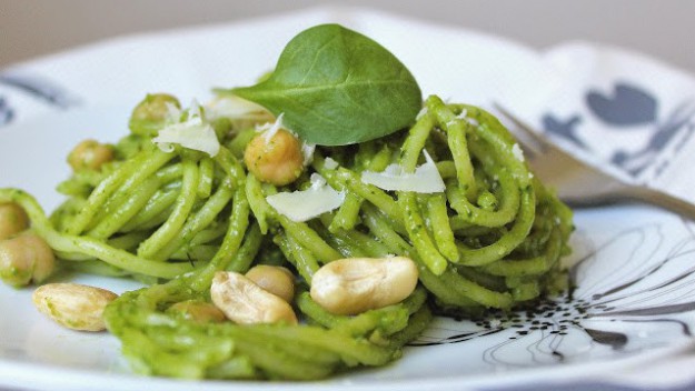 Těstoviny jsou úžasné v tom, že si je můžete připravit na mnoho způsobů. Tyto špagety jsou díky špenátovému pestu barevné a veselé.