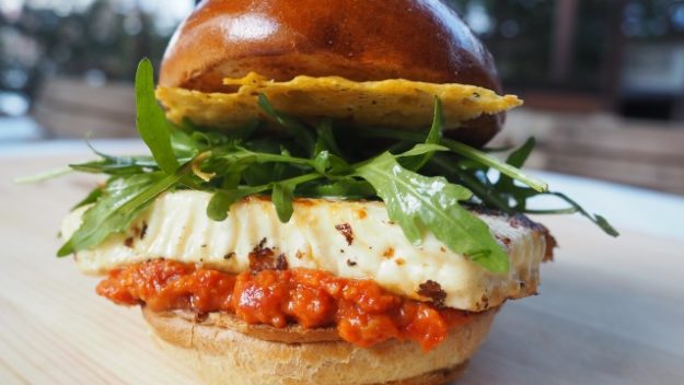 Netradiční burger s grilovanou giuncatou a chipsem ze sýru Gran Moravia.