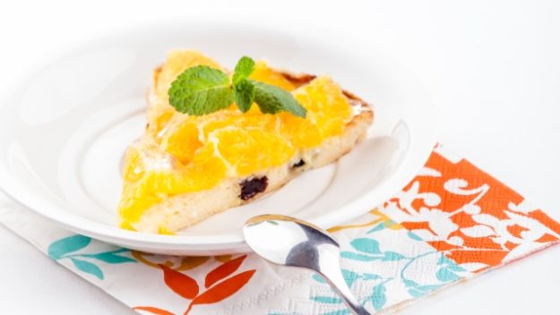 Dort z ricotty ozdobený citrusovými plody v želé.