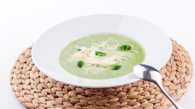 Brokolicový krém zdobený brokolicovými růžičkami a hoblinkami sýru.