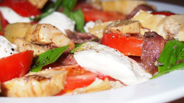 Svěží salát z rajčat a mozzarelly obohacený skvělou chutí italských nakládaných artyčoků.