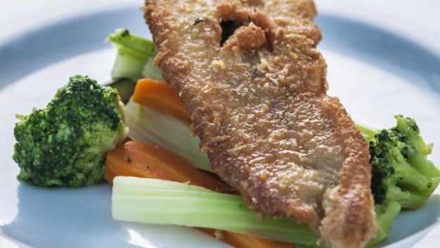 Obalovaný řízek z halibuta s tymiánem a sýrem Gran Moravia.