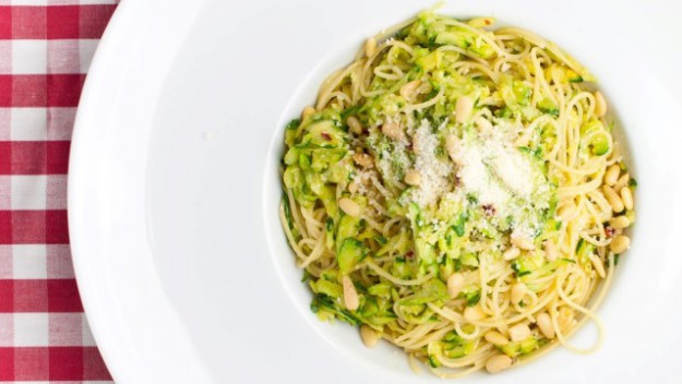 Jednoduchý a rychlý recept na pikantní těstoviny s cuketou obohacené nezaměnitelnou chuťí piniových oříšků.